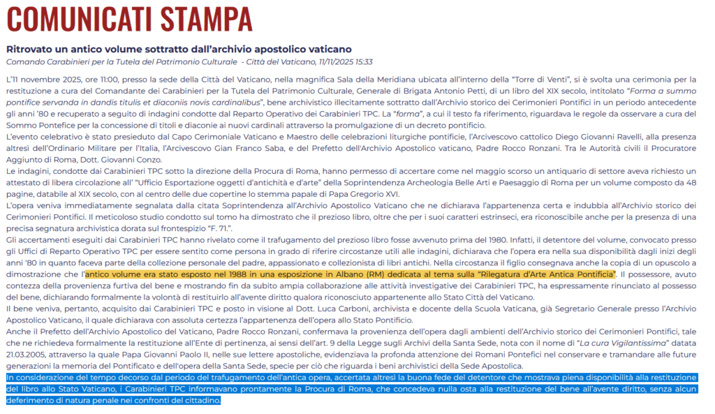 Jak podano w oficjalnych komunikatach, to wieloletni pracownik, wykładowca i aktualny sekretarz generalny Watykańskiego Archiwum Apostolskiego, prof. Luca Carboni, oświadczył z całą pewnością, że chodzi o rękopis należący do i skradziony (zagubiony?) Stolicy Apostolskiej, czego koronnym dowodem jest tłoczone w złocie oznaczenie F.71. Prawdziwość rękopisu potwierdził również Prefekt Apostolskiego Archiwum Watykańskiego, ojciec Rocco Ronzani OSA, współbrat zakonny Papieża Leona XIV.