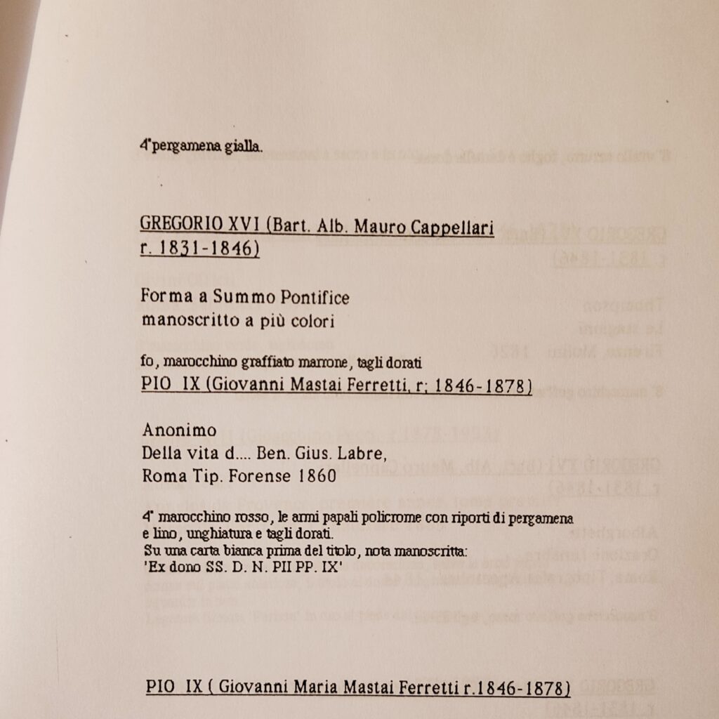 Posiadamy jednak kopię katalogu tej wystawy, w którym wymienionych jest 9 ksiąg w ozdobnych oprawach z herbem Papieża Grzegorza XVI, w tym rękopis F.71 opisany jako Forma a Summo Pontifice, manoscritto a più colori, fo[lio], marocchino graffiato marrone, tagli dorati (brak numeracji stron oraz numeracji eksponatów). Organizatorami instytucjonalnymi wystawy był wydział kultury Albano (Assessorato alla Cultura, Comune di Albano Laziale) oraz tamtejsze muzeum (Museo civico di Albano). Z kolei odpowiedzialnymi za właściwą organizację byli: dr Giuseppe Chiarucci (główny organizator), Paolo Dotti (organizator techniczno-naukowy) i dr Anna Crisi (odpowiedzialna za katalog). Autorem wprowadzenia do katalogu był Guido Vianini Tolomei. Katalog obejmuje 79 eksponatów. Kilkanaście z nich nadal można znaleźć w ofercie antykwariatu. To właśnie po zakończeniu tej wystawy manuskrypt miał zostać skradziony – taki przekaz został oficjalnie podany, a następnie podjęty dalej, przy jednoczesnej dziennikarskiej deprecjacji „prywatnych kolekcjonerów”, którzy mieli manuskrypt z premedytacją ukrywać przez dziesięciolecia.