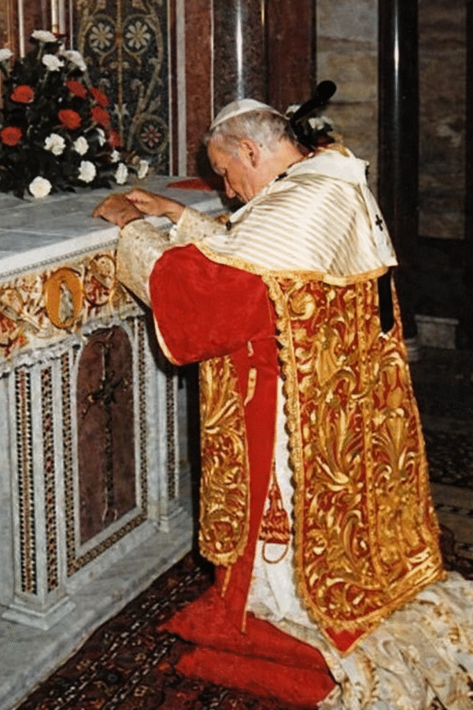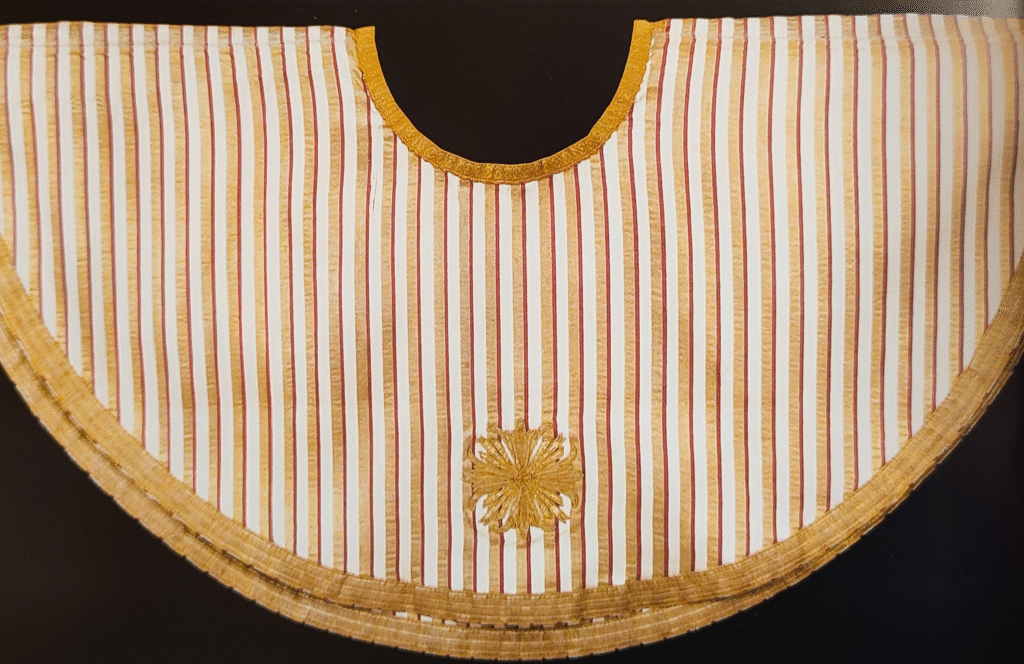 Some of the most iconic photographs from Pope John Paul II’s pontificate, especially in terms of liturgy, are the very few taken during his visit to St. Cecilia’s Basilica on November 22, 1984. This is because the pope wore not only ancient, beautiful, and even magnificent liturgical vestments, but above all a fanon, a vestment reserved for the Bishop of Rome (only the Patriarch of Lisbon has a special apostolic indult allowing him to wear this vestment).
