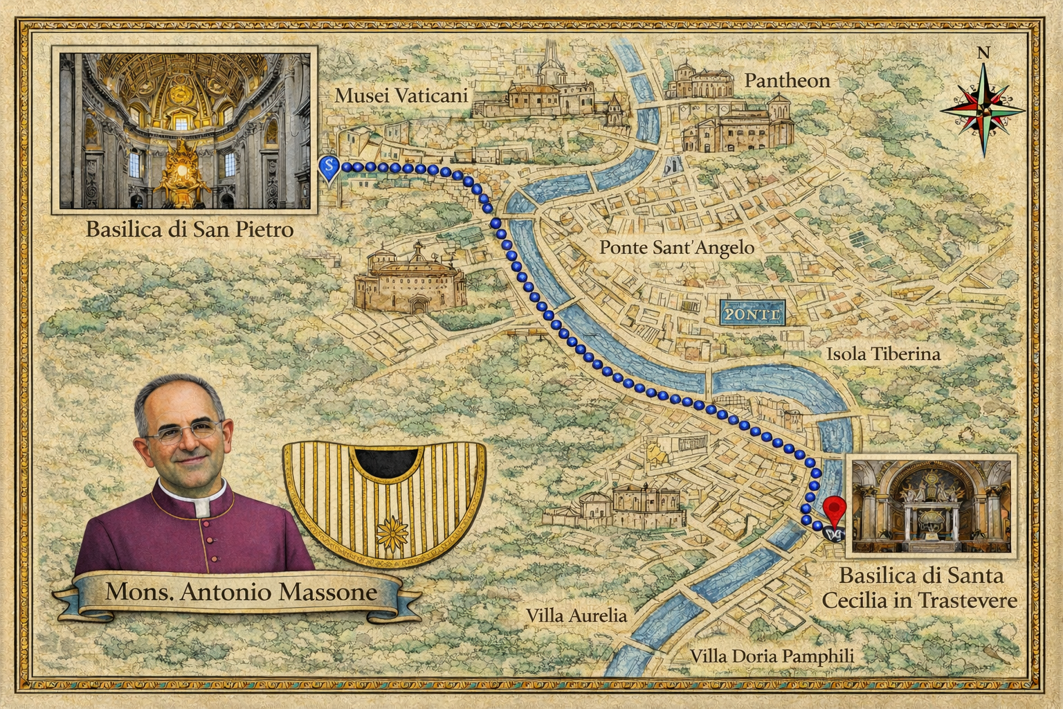 It was the brainchild of Monsignor Antonio Massone, then rector of the church and one of the then papal masters of ceremonies. He began his Vatican career on April 9, 1968, when he was appointed Archivist of the Apostolic Chancery: one of his main responsibilities was editing papal documents in Latin. Monsignor Massone was appointed to the College of Masters of Apostolic Ceremonies on January 17, 1972, by Pope Paul VI and served until 1991. This meant he had direct access to the sacristy and treasury of St. Peter’s Basilica. It is also difficult to imagine that the idea of using the fanon would have been opposed by the then and last Sacristan of the Apostolic Palace (Sacrista del Palazzo Apostolico), Archbishop Petrus Canisius van Lierde O.S.A., who had held his position since January 13, 1951. Monsignor Antonio Massone was appointed Rector of the Basilica of St. Cecilia in Trastevere on February 24, 1978, by Cardinal Ugo Poletti, whose personal secretary he had been from 1973 to 1988. On January 6, 1990, Cardinal Poletti, as Vicar General of the Diocese of Rome, appointed him his delegate for Catholics of the Eastern Churches residing in Rome. During the homily delivered during the funeral Mass of Monsignor Antonio Massone in June 1997, Cardinal Virgilio Noè (Master of Pontifical Ceremonies from 1970 to 1982) emphasized his immense commitment both to the restoration of the basilica and the monastery and – perhaps above all – to improving the quality of the liturgy. Monsignor Massone became known in Rome for revitalizing liturgical life in the basilica and for attracting and engaging young people in the parish, who, during the funeral, thanked him for lifting many of them from their downfall, taking them off the streets and teaching them to love and pray to God. Father Massone died unexpectedly on May 31, 1997, after singing Vespers with the Benedictine nuns in the basilica, to which he had devoted a significant part of his life and work.