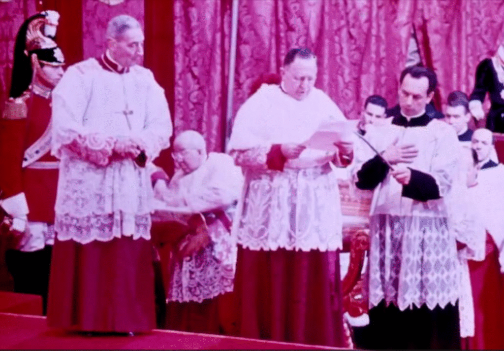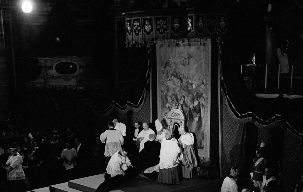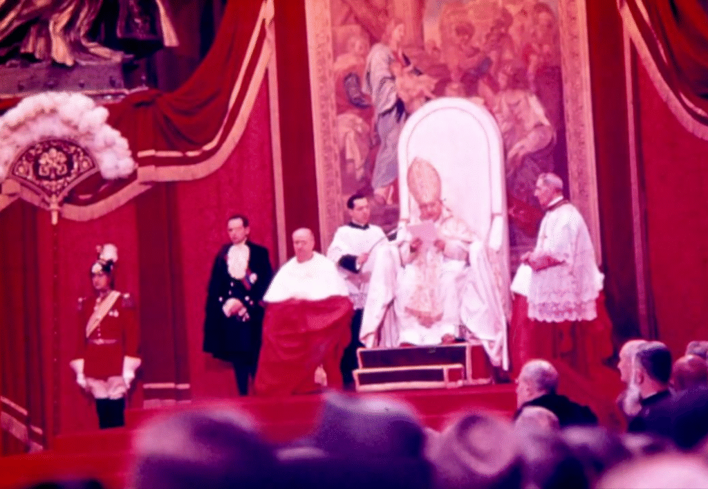 During his solemn coronation on the main loggia of St. Peter’s Basilica, Pope John XXIII asks Monsignor Enrico Dante what should be done next.