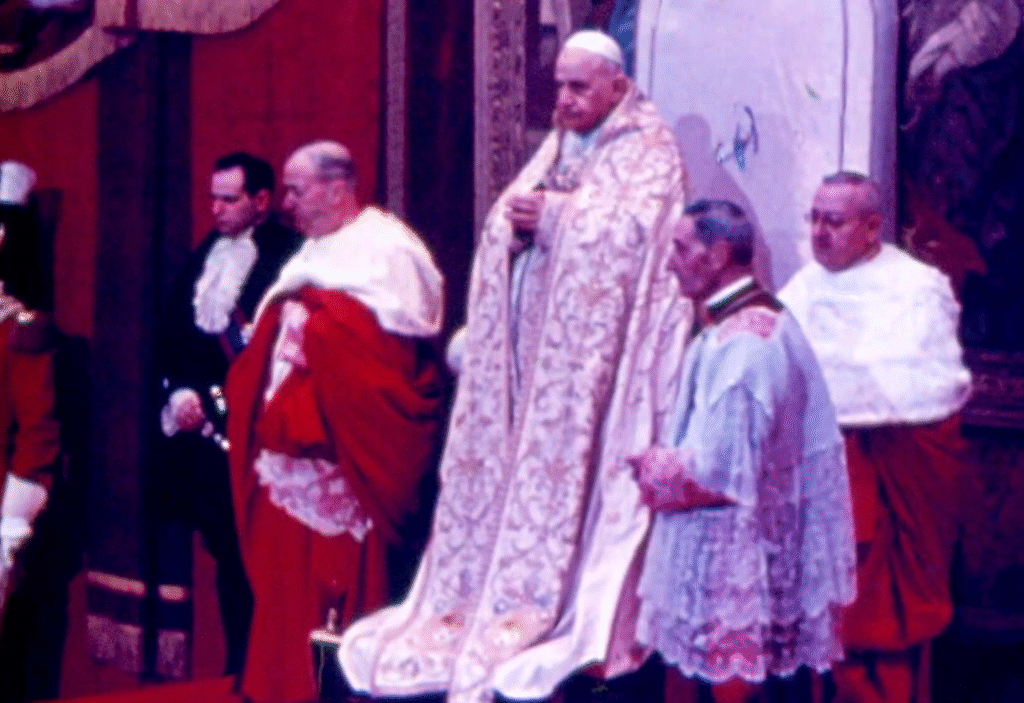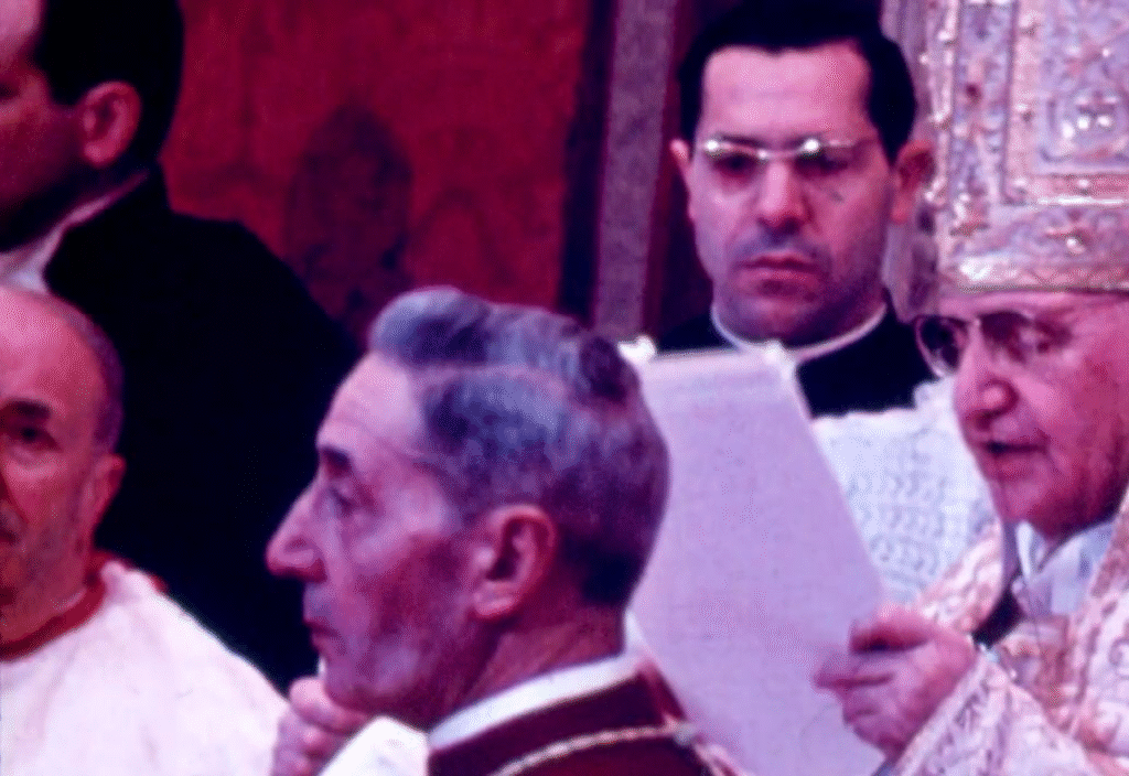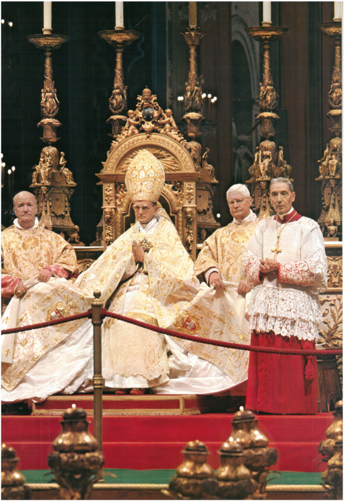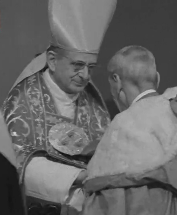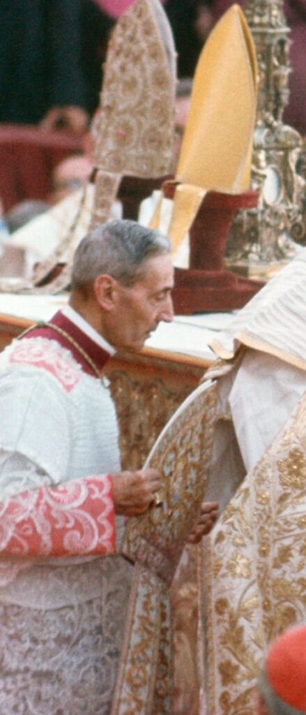 Monsignor Enrico Dante assists Paul VI during the solemn papal Mass and coronation in St. Peter’s Square.