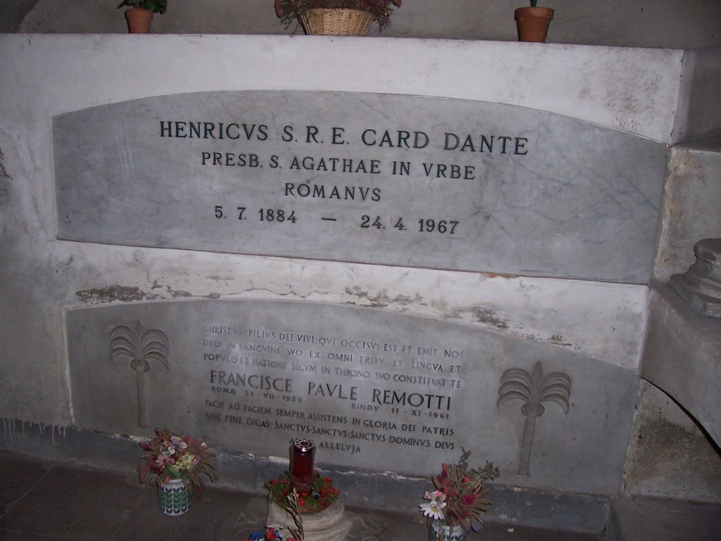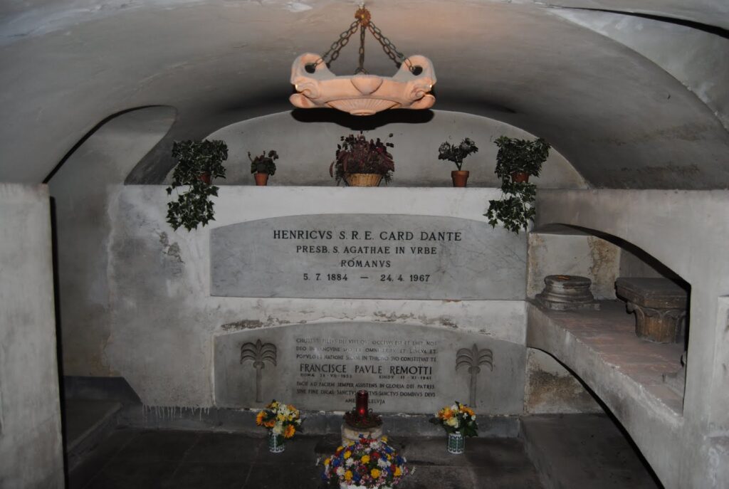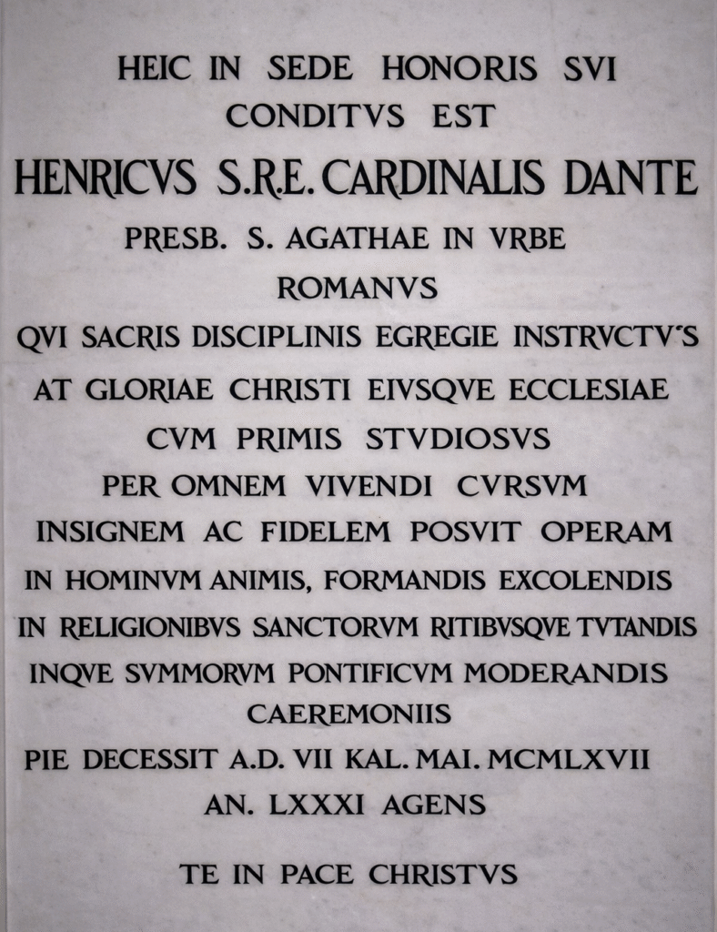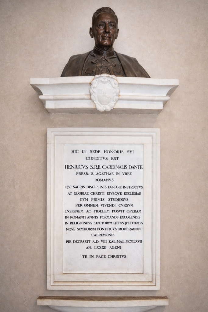 Cardinal Enrico Dante was buried in his titular church in Rome, where he rests to this day. His final resting place is located there, next to which a bust and a commemorative plaque have been placed, on which we read: