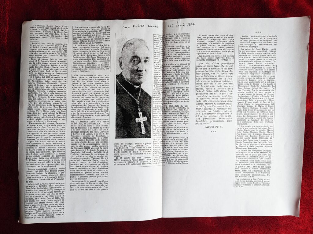 Article in memoriam of Cardinal Enrico Dante published in Osservatore Romano on April 24, 1967.